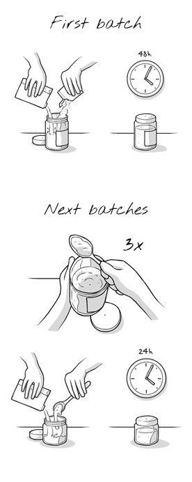 Vezměte prosím na vědomí, že všechny další šarže z tohoto originálního sáčku potřebují ke kultivaci pouze 24 hodin. Z každé čerstvé dávky odeberte 3 polévkové lžíce, jak je uvedeno výše, a proces opakujte. Po 4 až 5 týdnech, kdy kefír začíná být řídký a vodnatý, použijte nový balíček kefíru a restartujte cyklus. Připravený kefír by měl být skladován v chladničce a spotřebován do 48 hodin.